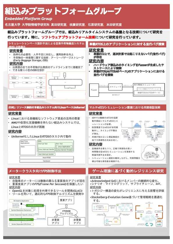 組込みソフトウェアプラットフォームグループでは、組込みリアルタイムシステムにおけるソフトウェア基盤技術に焦点を当てた研究を行っています。 リアルタイムOS、ハイパーバイザ、ユニカーネル、コンテナなどの基盤ソフトウェアに関する理論・設計・実装を進め、次世代の組込みシステムを支える高信頼・高性能なプラットフォームの構築を目指しています。